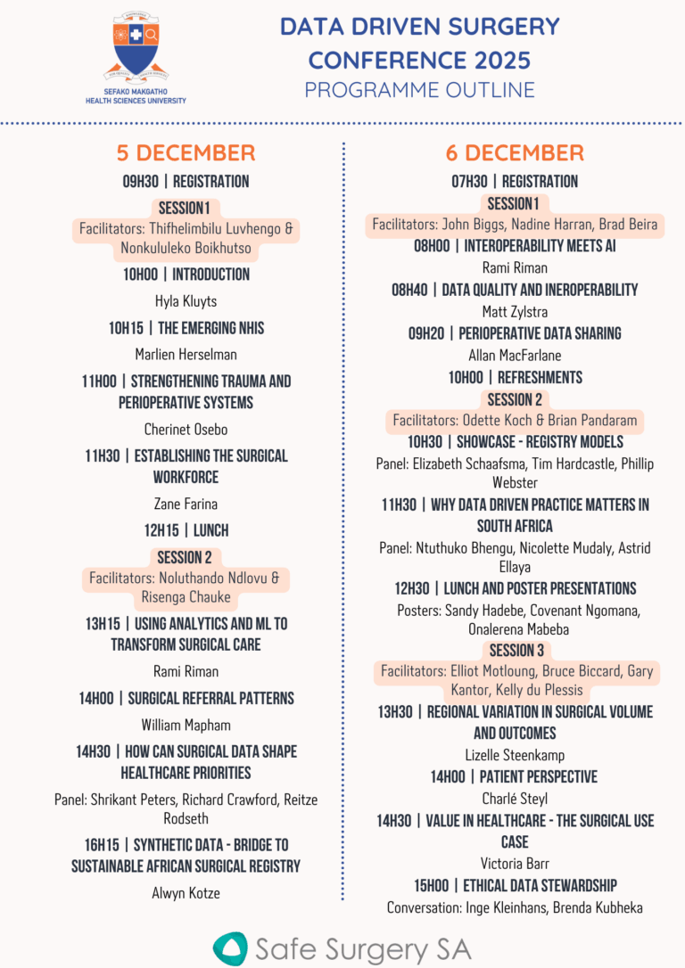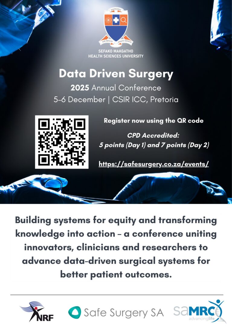 On Wednesday the 4th of December 2024, a conference on Data Driven Surgery: Empowering Policy & Practice, was co-hosted by Sefako Makgatho Health Sciences University (SMU) and Safe Surgery SA. The programme included impactful presentations by high-profile South African and Namibian colleagues, and insightful discussions guided by illustrious panellists. Find the programme here.
